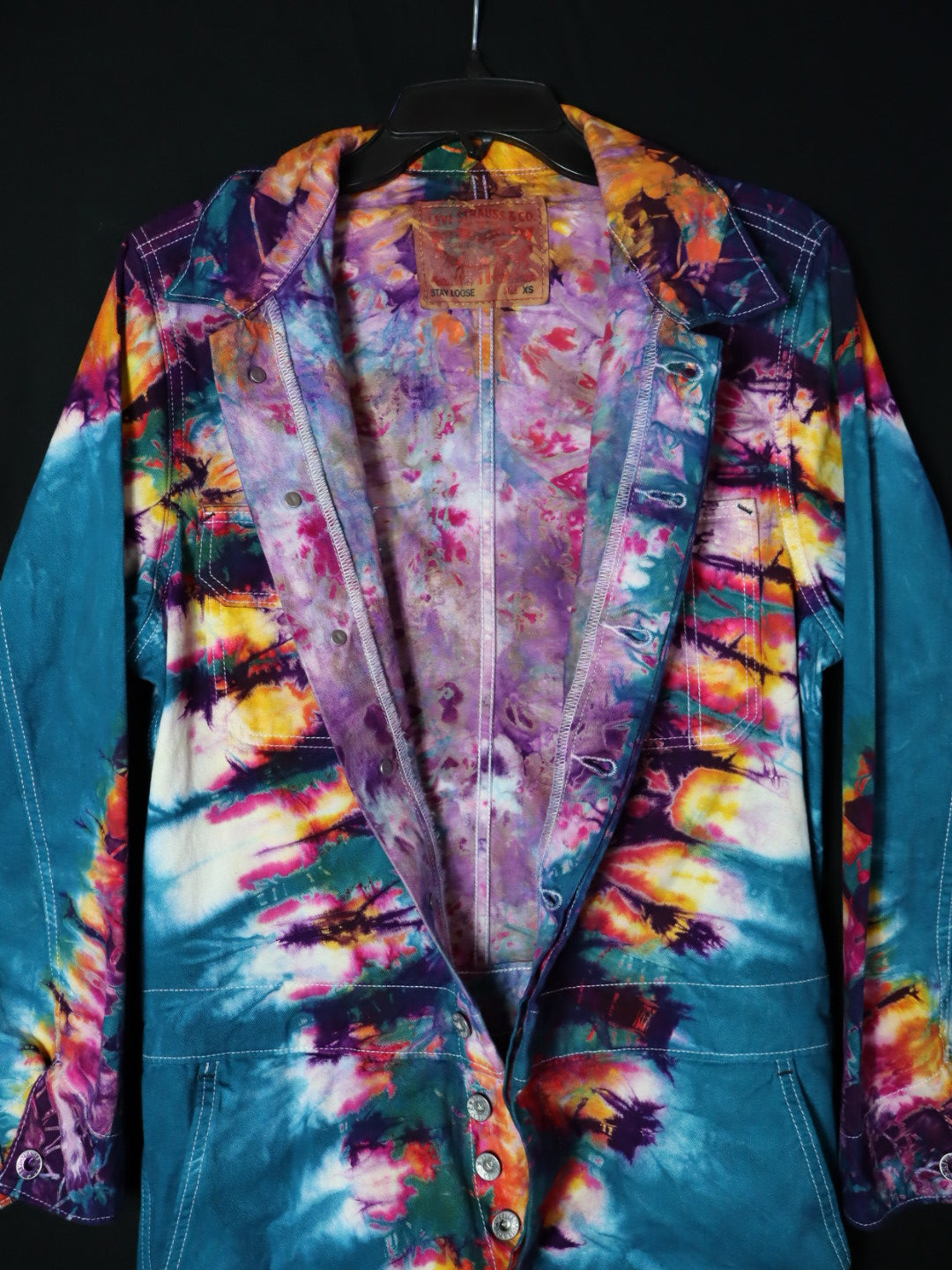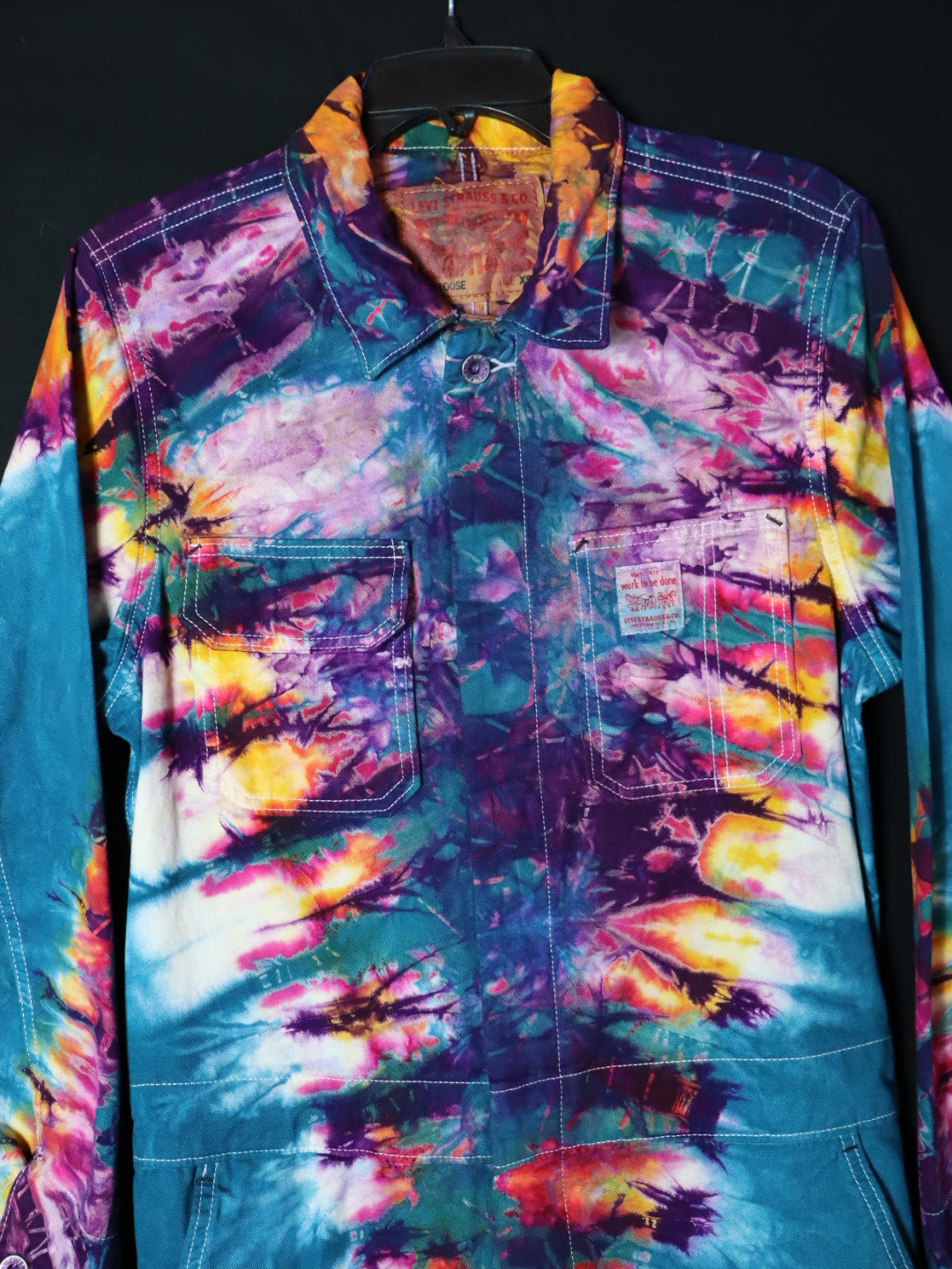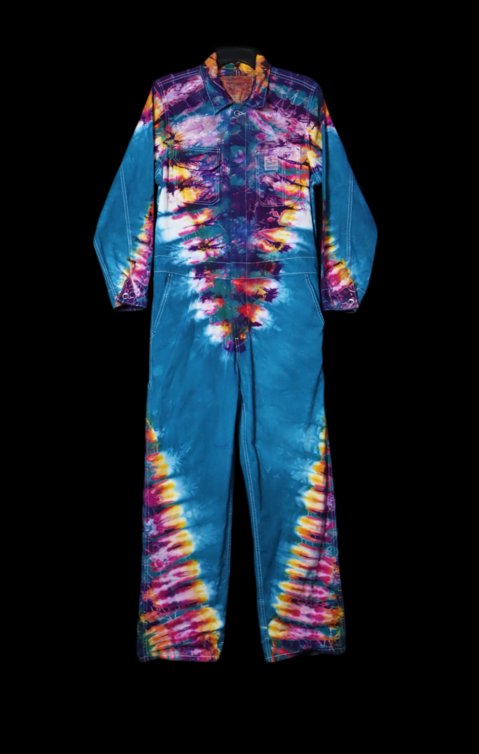 Cobalt glowing with gold pink on the most chillaxed coverall blank we have ever dyed. These Levis loose fitted coveralls are the ultimate 100% cotton one peice for all your tiedye statement needs.