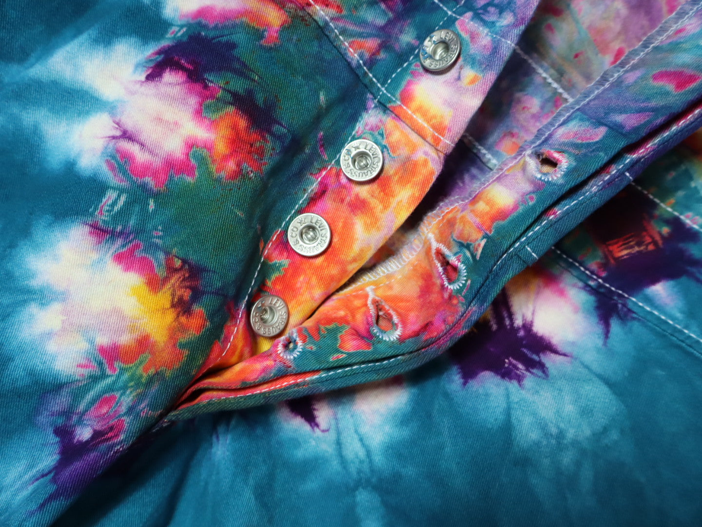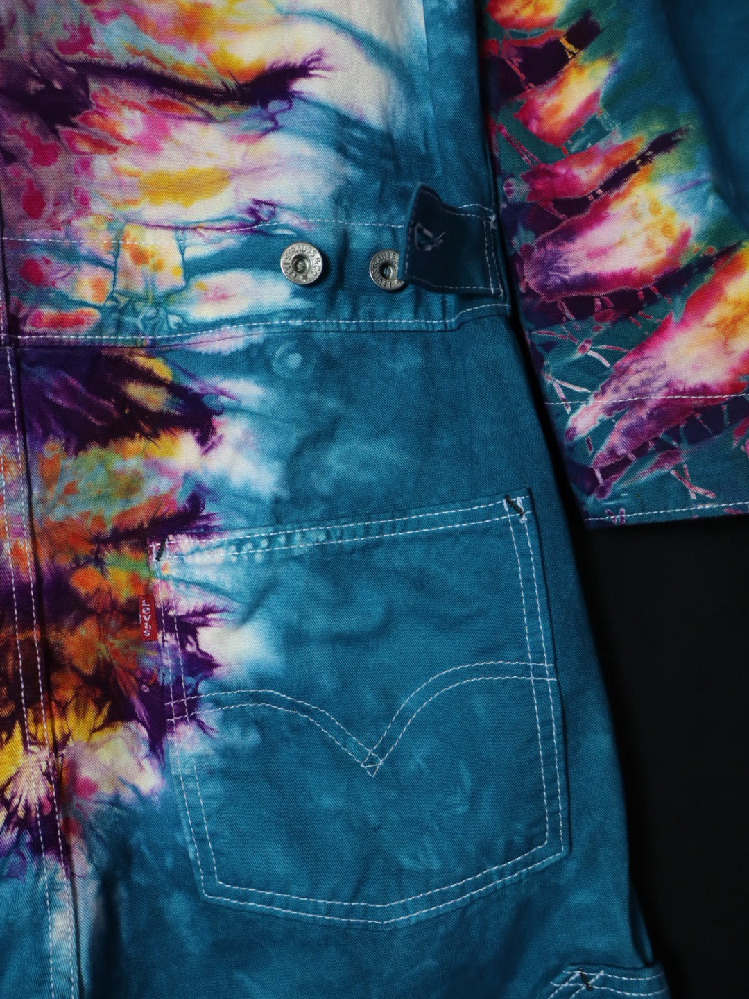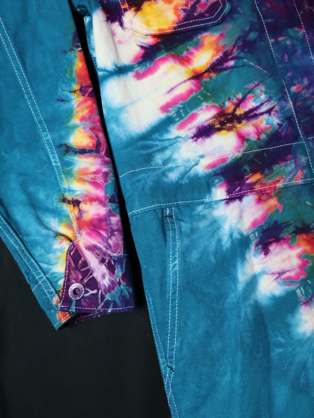 Cobalt glowing with gold pink on the most chillaxed coverall blank we have ever dyed. These Levis loose fitted coveralls are the ultimate 100% cotton one peice for all your tiedye statement needs.